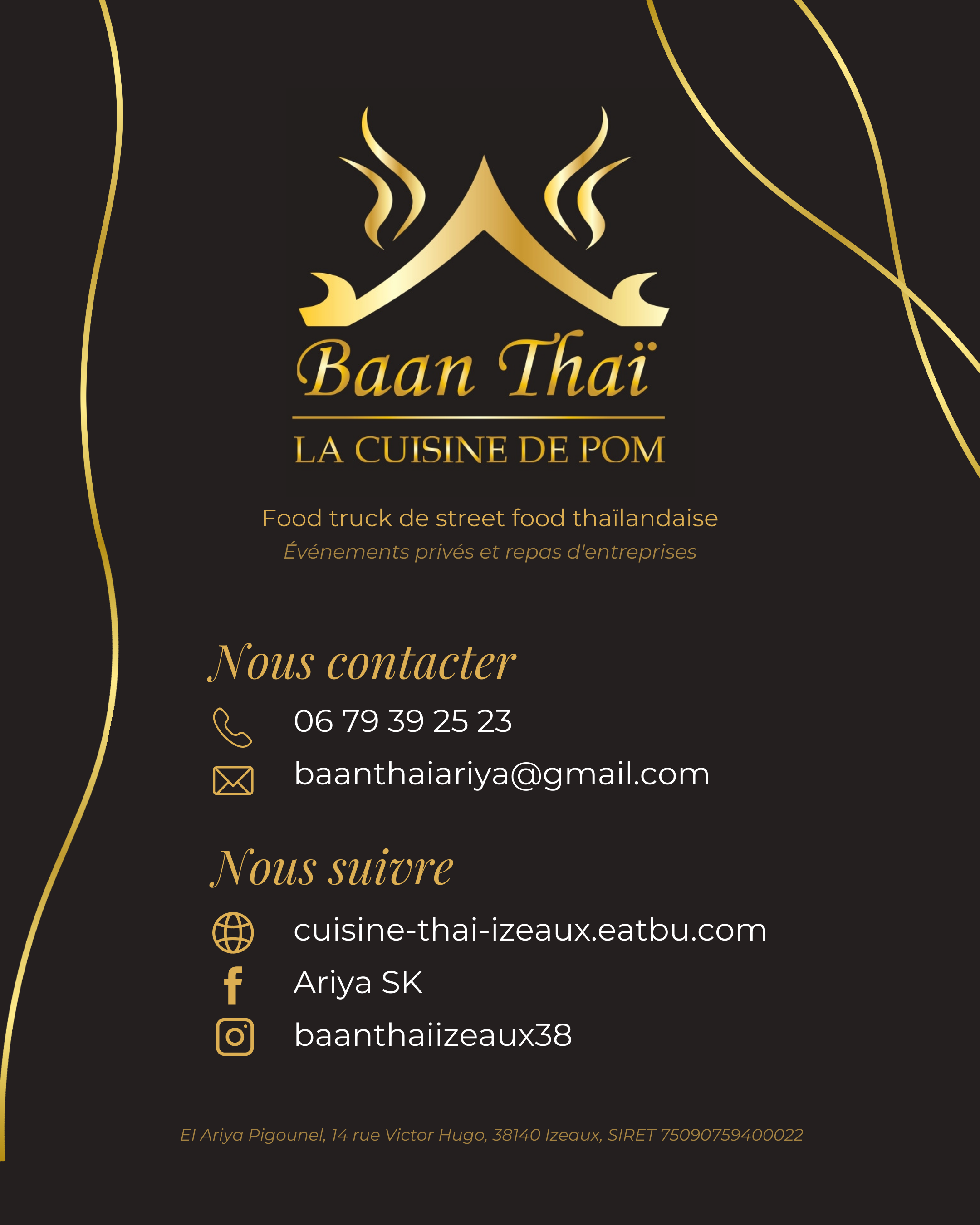 Notre food truck thaï se déplace pour vous offrir une expérience savoureuse et authentique. Privatisez notre service pour vos fêtes, anniversaires ou repas d'entreprises et régalez vos invités avec nos spécialités thaïlandaises